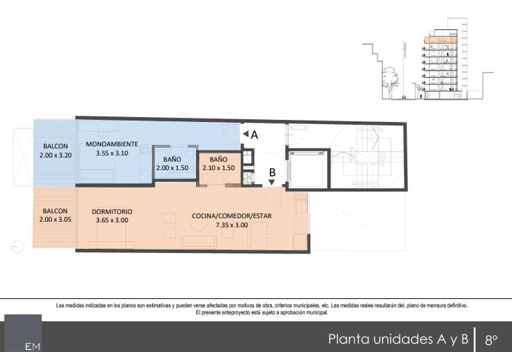 Unidades de monoambiente A: 30 m2 totales, de los cuales 27 m2 cubiertos, y 3 m2 de balcon al frente.