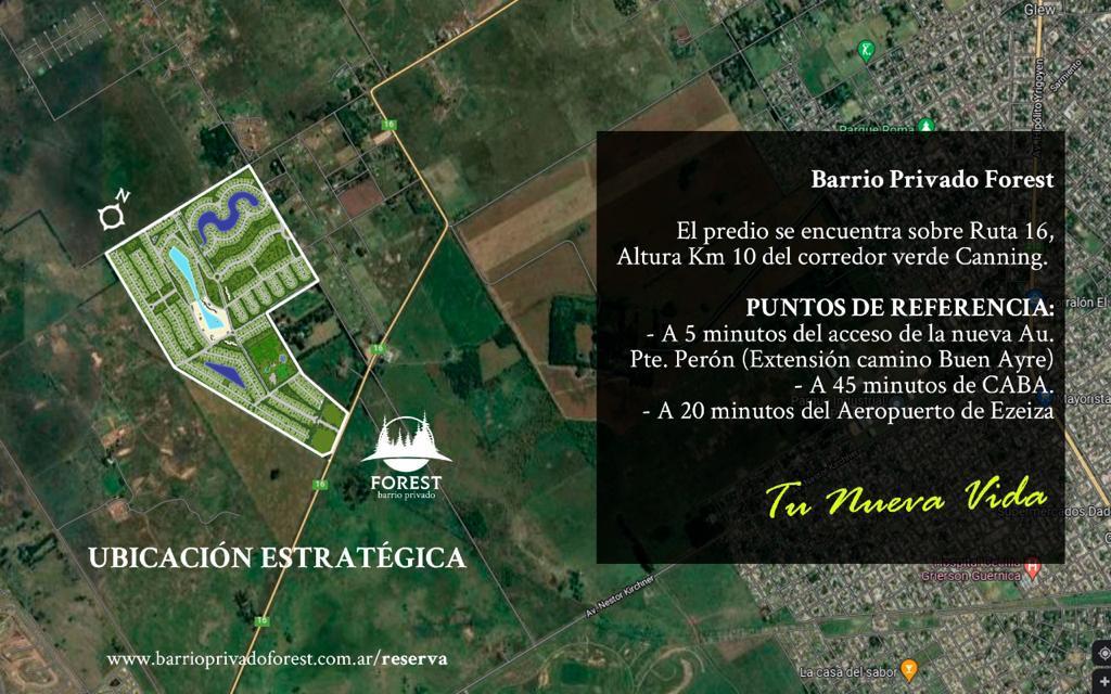 Forest Barrio Privado se desarrolla sobre la ruta 16 en el nuevo corredor verde Canning. Sobre un predio de 121 hectáreas con un entorno natural de arboleda frondosa y una excelente conectividad vehicular.