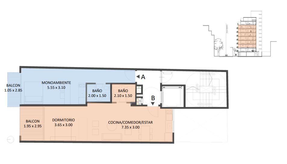Unidades de monoambiente A: 30 m2 totales, de los cuales 27 m2 cubiertos, y 3 m2 de balcon al frente.