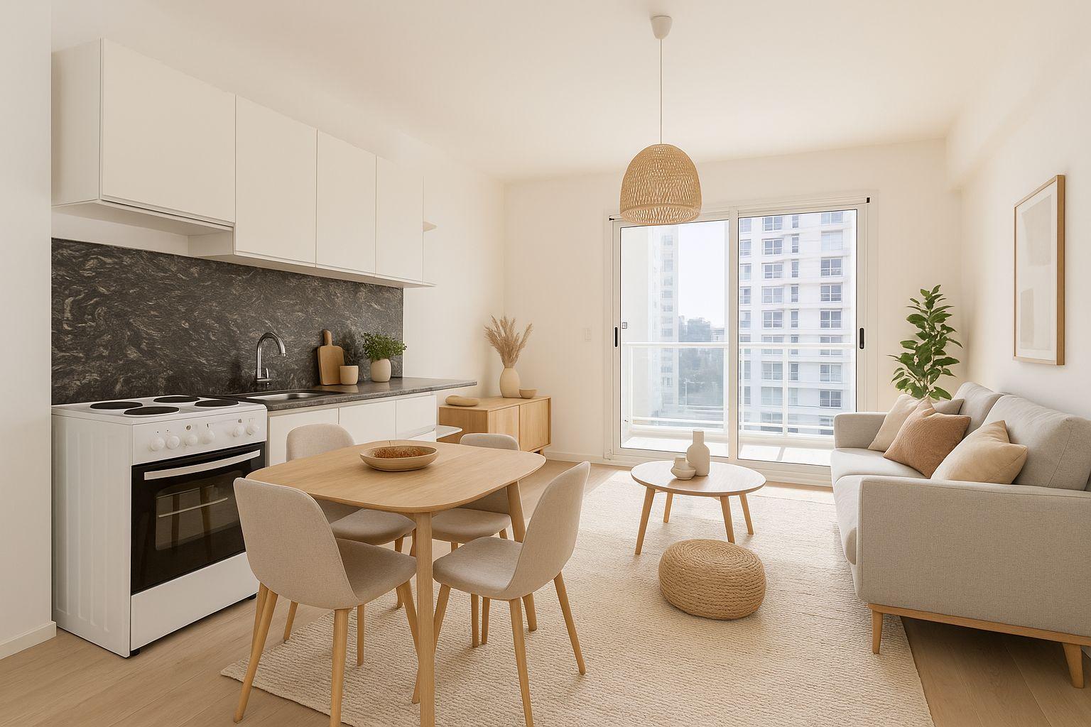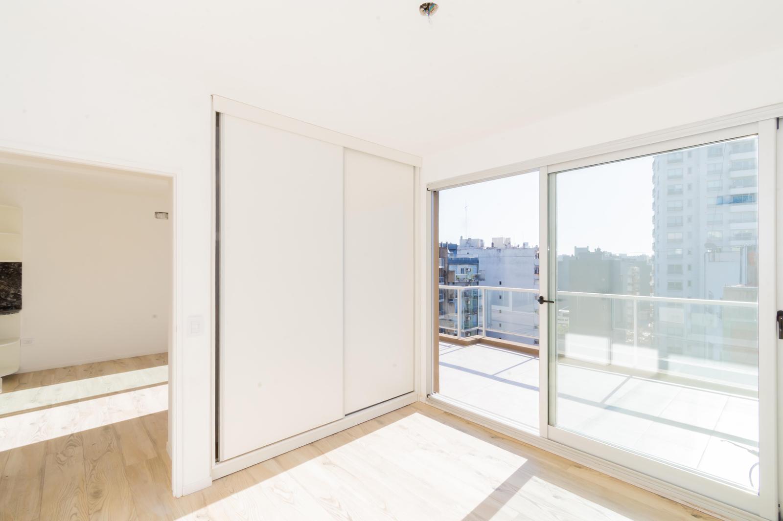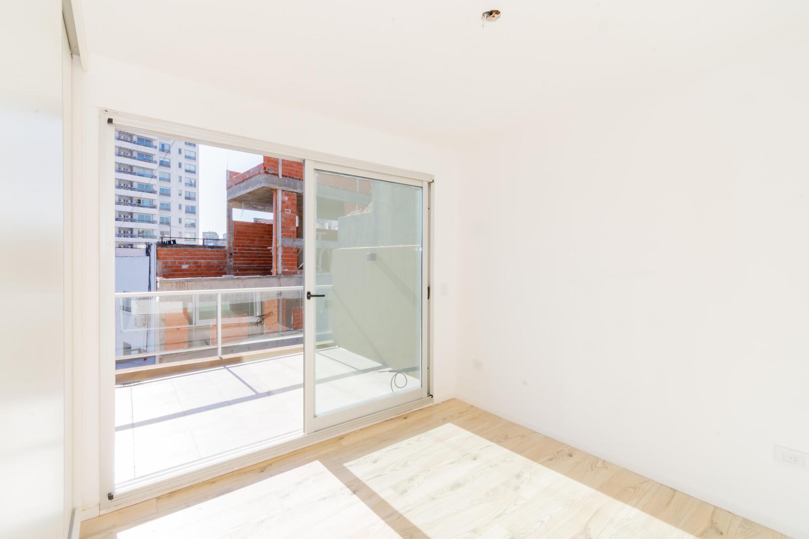 Los pisos de porcelanato símil madera aportan un acabado elegante y uniforme en todo el departamento. El dormitorio es amplio y cuenta con un placard de gran tamaño con puertas corredizas ya instaladas.