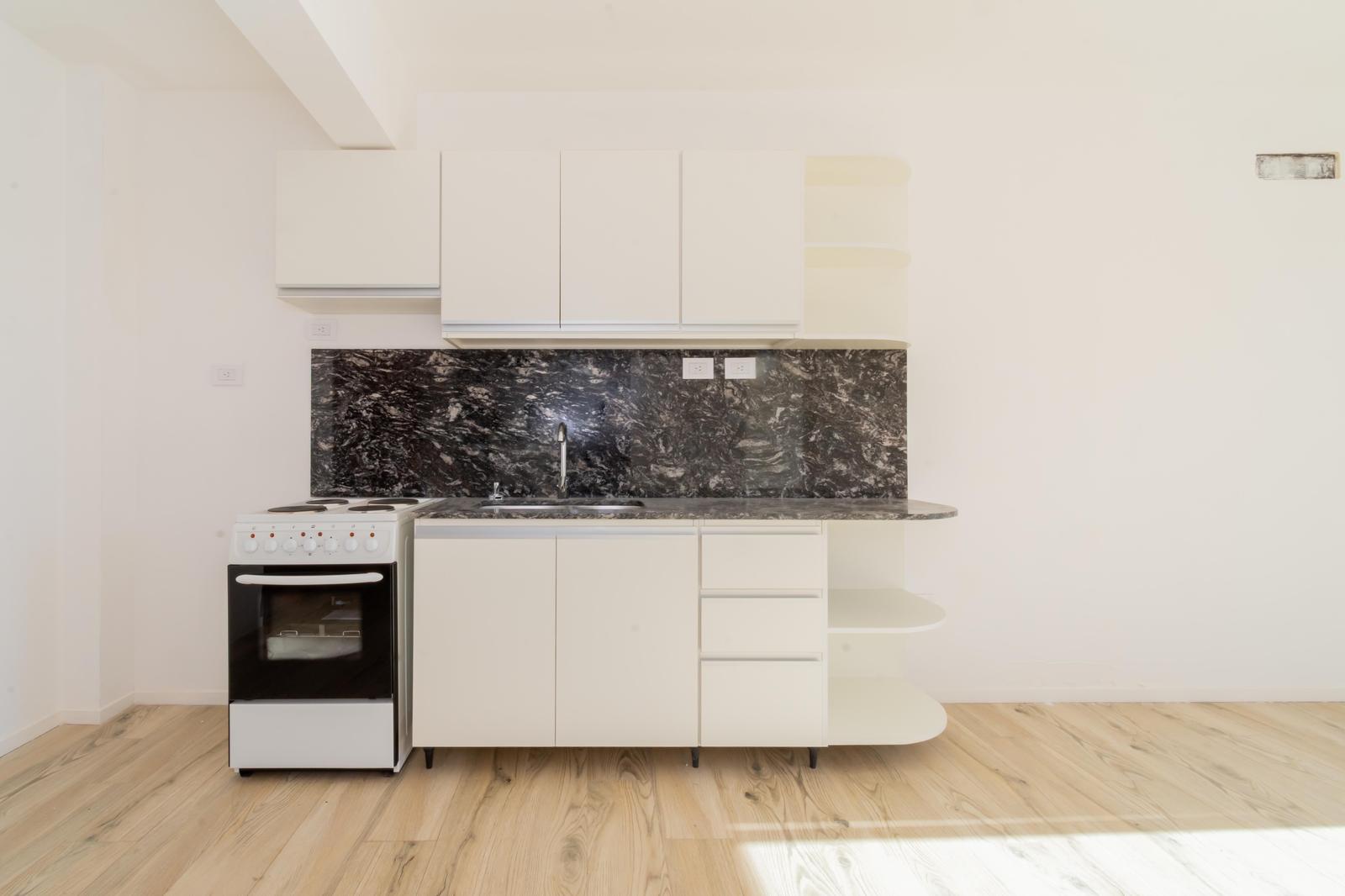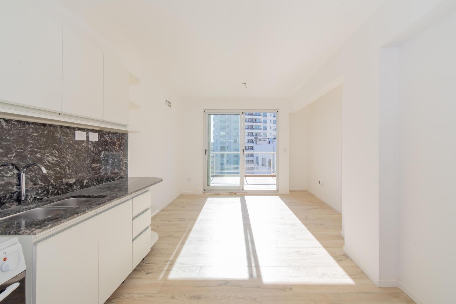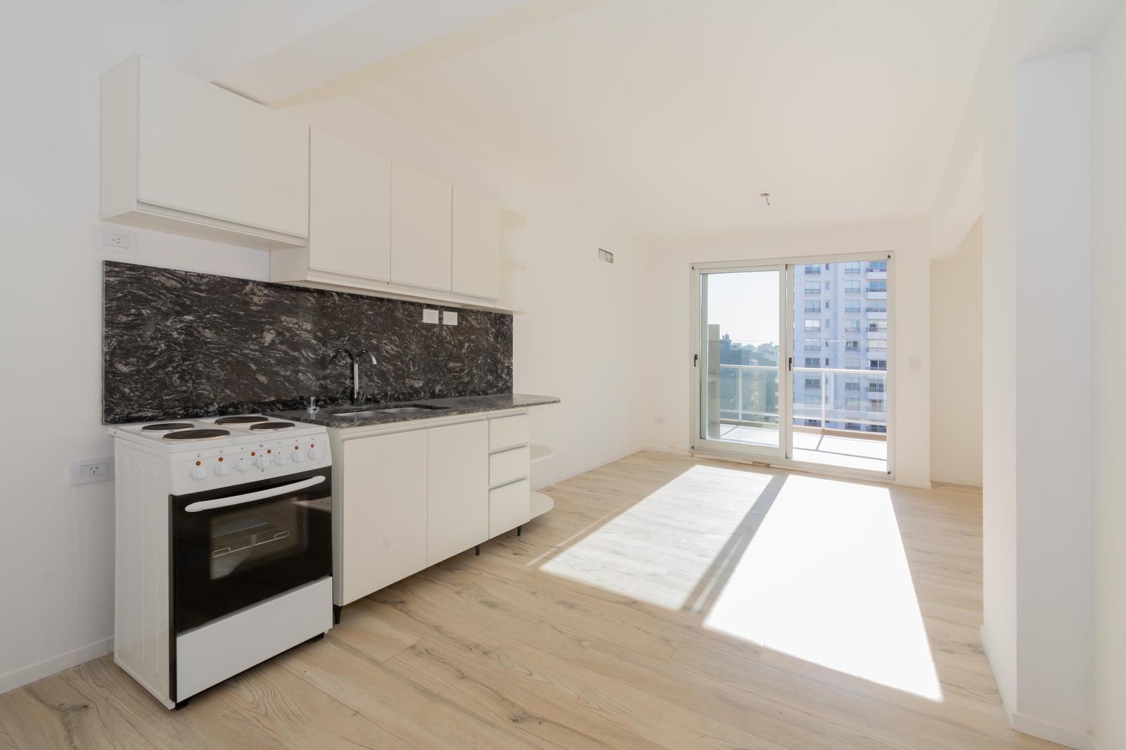 El ingreso es a través del living, que cuenta con cocina integrada con la opción de agregar una barra para dividir el ambiente. La cocina está equipada con muebles blancos de excelente calidad, mesada de mármol negro, horno y anafe eléctrico.