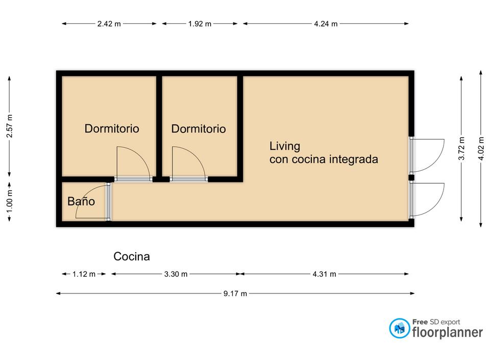 Superficie: 42,6 m²3 ambientes: Living, 2 dormitorios y cocina integrada.Cocina integrada con muebles bajo mesada y alacena.Muy iluminado, con ventanas amplias que brindan excelente luz natural durante el día.Baño completo.Patio compartido con el vecino.