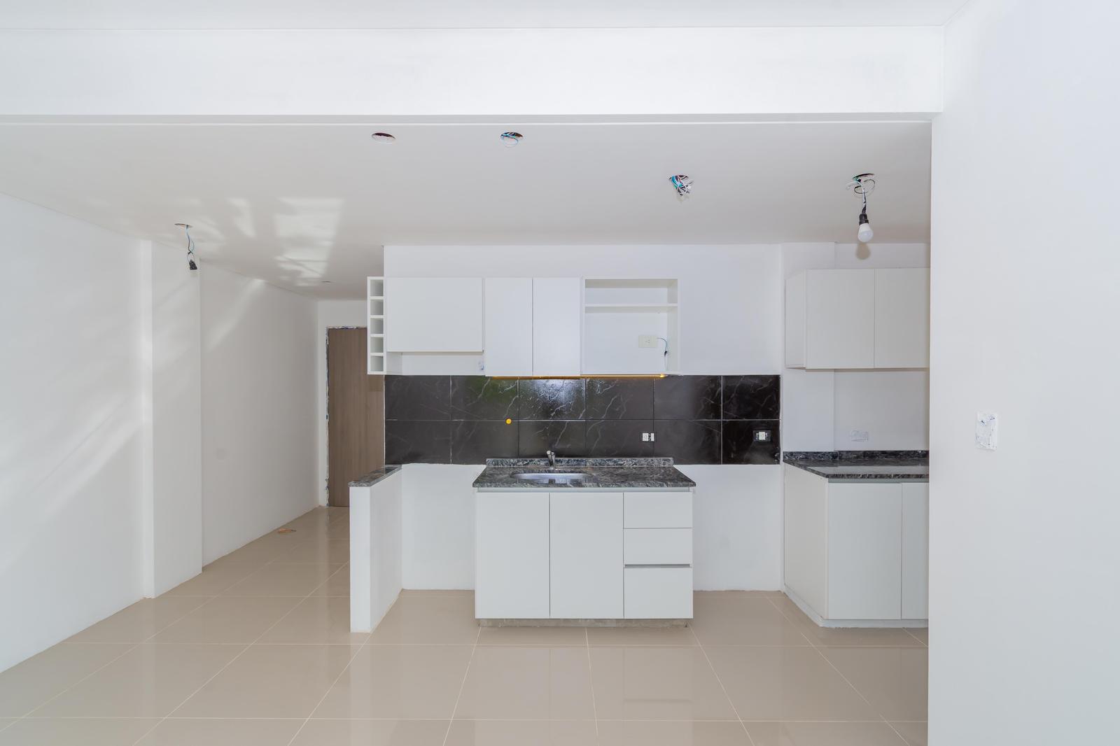 EQUIPAMIENTO EN COCINA : Muebles de Alacena y Bajo mesada, en laminado con herrajes exteriores en platil o similar. Mesada en granito gris Mara o negro Brasil, con zócalo perimetral. Pileta de cocina en acero inoxidable (0.45ancho) calidad Premium. Grifería: Monocomando , linea FV o similar. Campana extractora sobre cocina, en acero inoxidable, marca TST modelo circular de 60 o similar, a convenir.