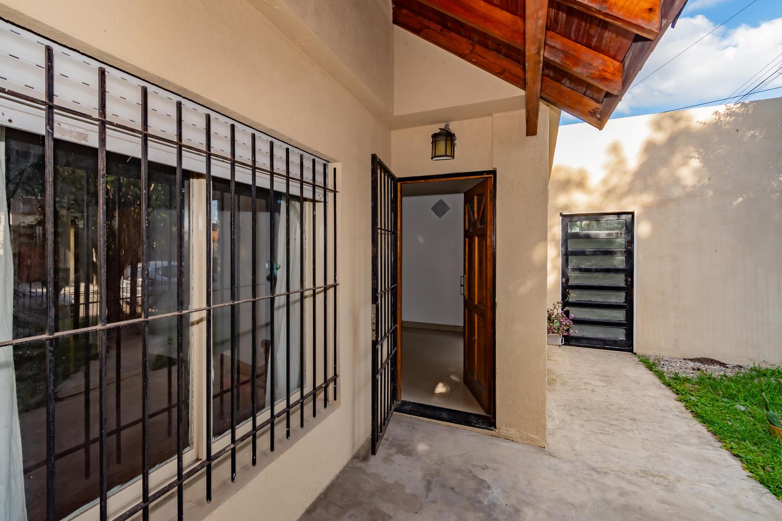 Se ingresa por un portón de reja y un patio frontal recibidor, al ingresar a la casa tenemos un living comedor integrado a la cocina, a la derecha de este ambiente la primera habitación con su baño, luego y pasando el ambiente de la cocina un pasillo distribuidor con un baño y dos habitaciones con ventanas al jardín. A la izquierda de la cocina la puerta conduce a una cochera cubierta para 2 autos, luego de esto se encuentra el jardín con parrilla y una habitación de guardado.