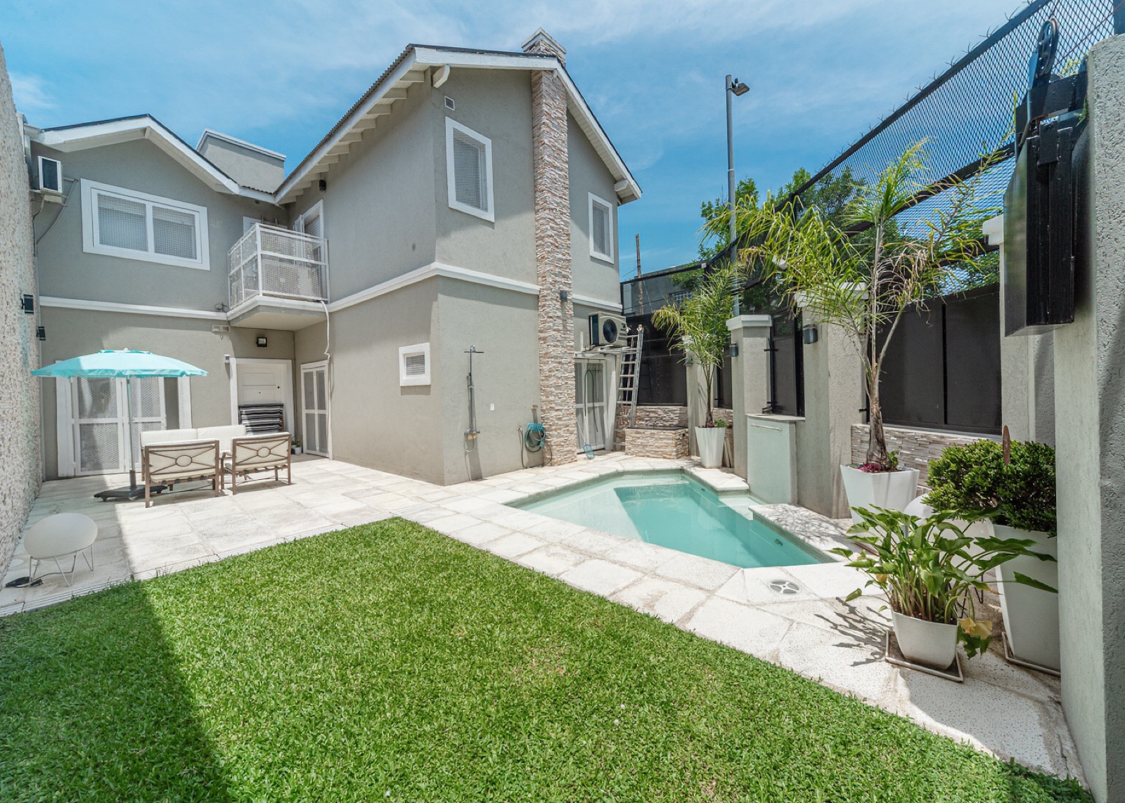 El espacio al aire libre es uno de los grandes diferenciales de la casa: sector verde, parrilla, espacio para el auto y una pileta climatizada, ideal para disfrutar durante todo el año.