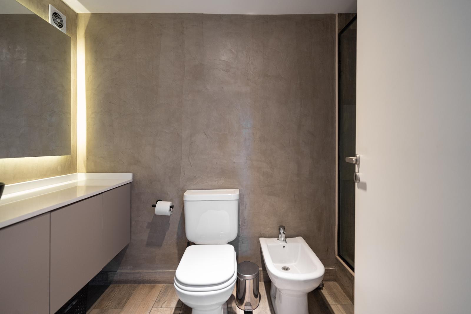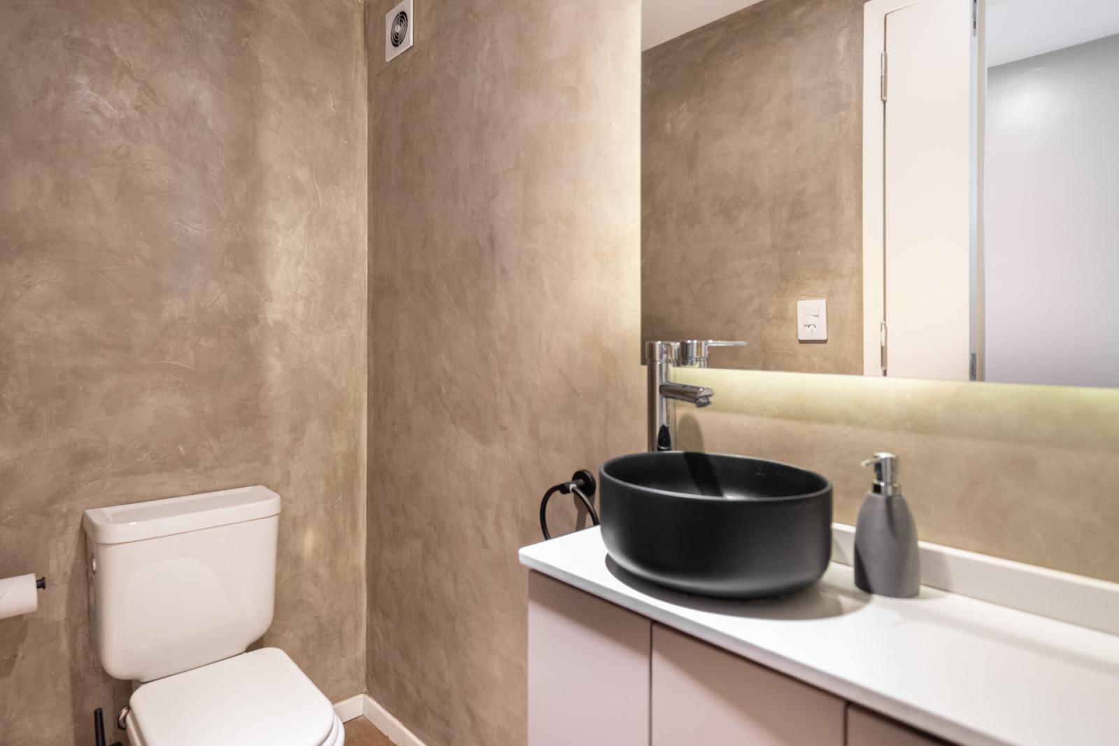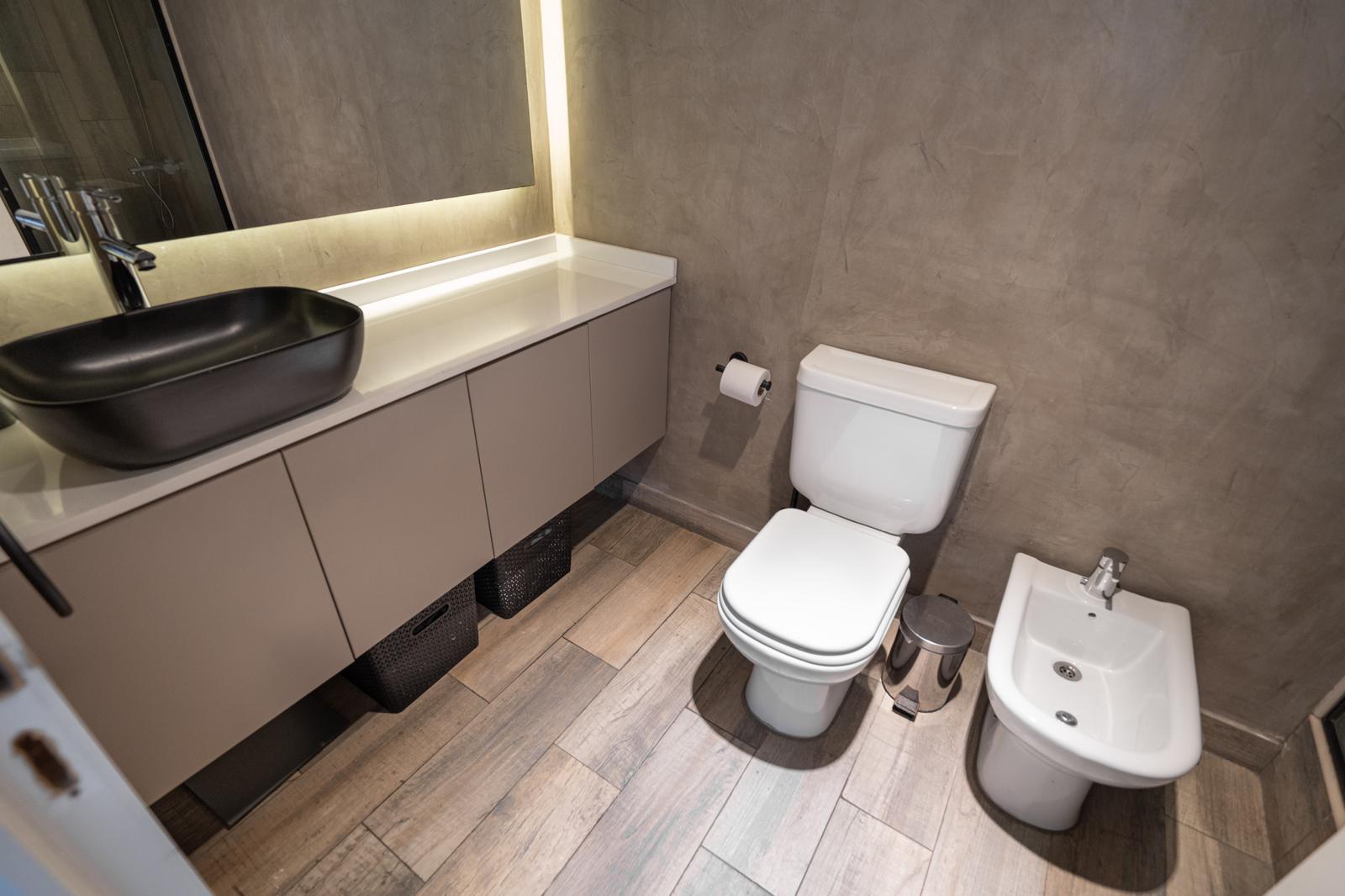 Un baño completo (en suite) y un toilette, ambos revestidos en microcemento con muebles de mdf premium y mesadas de silestone.