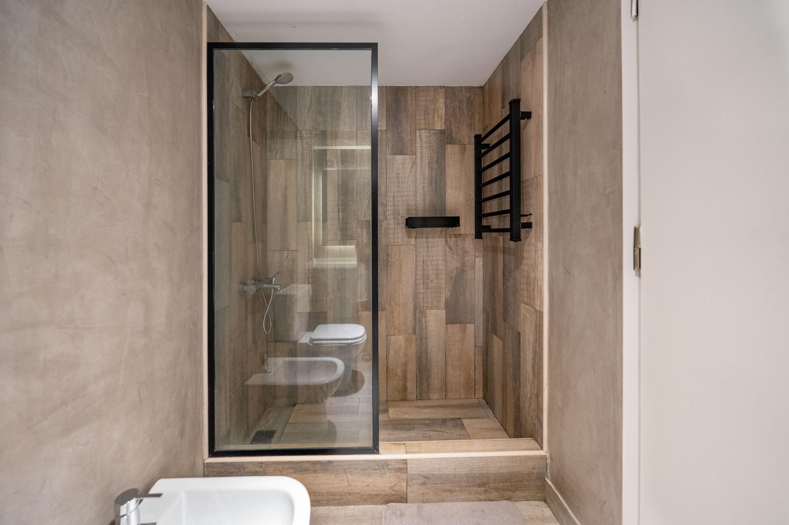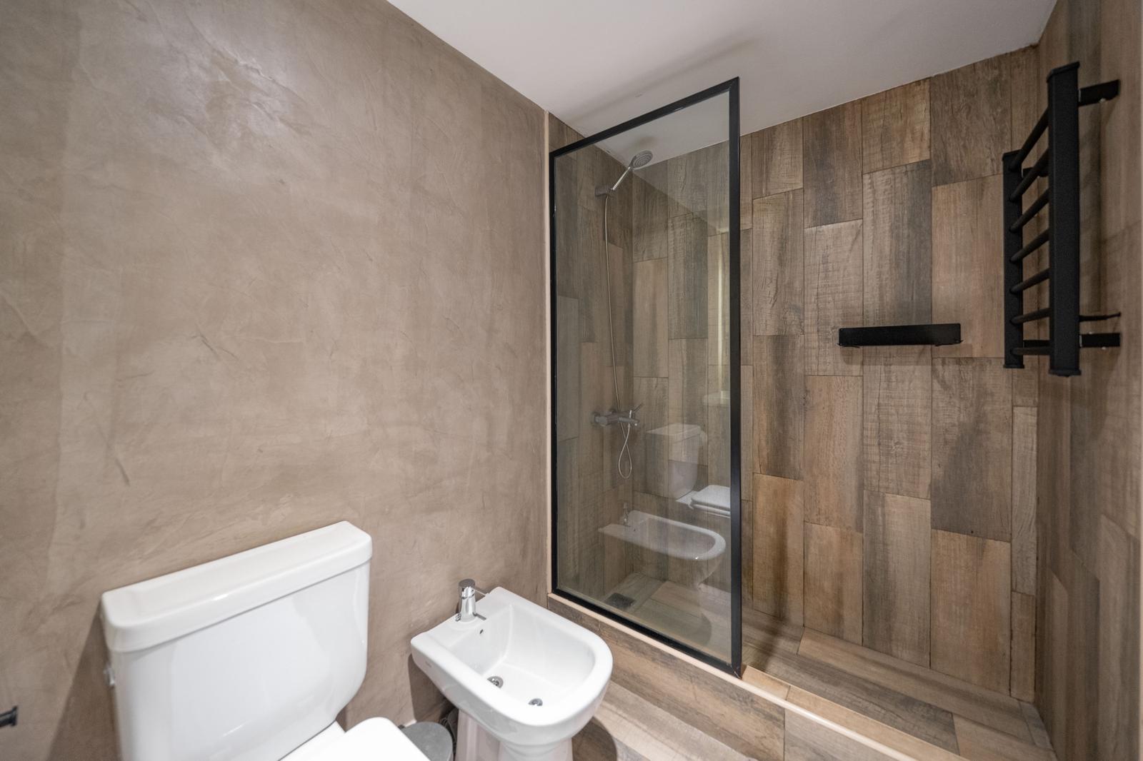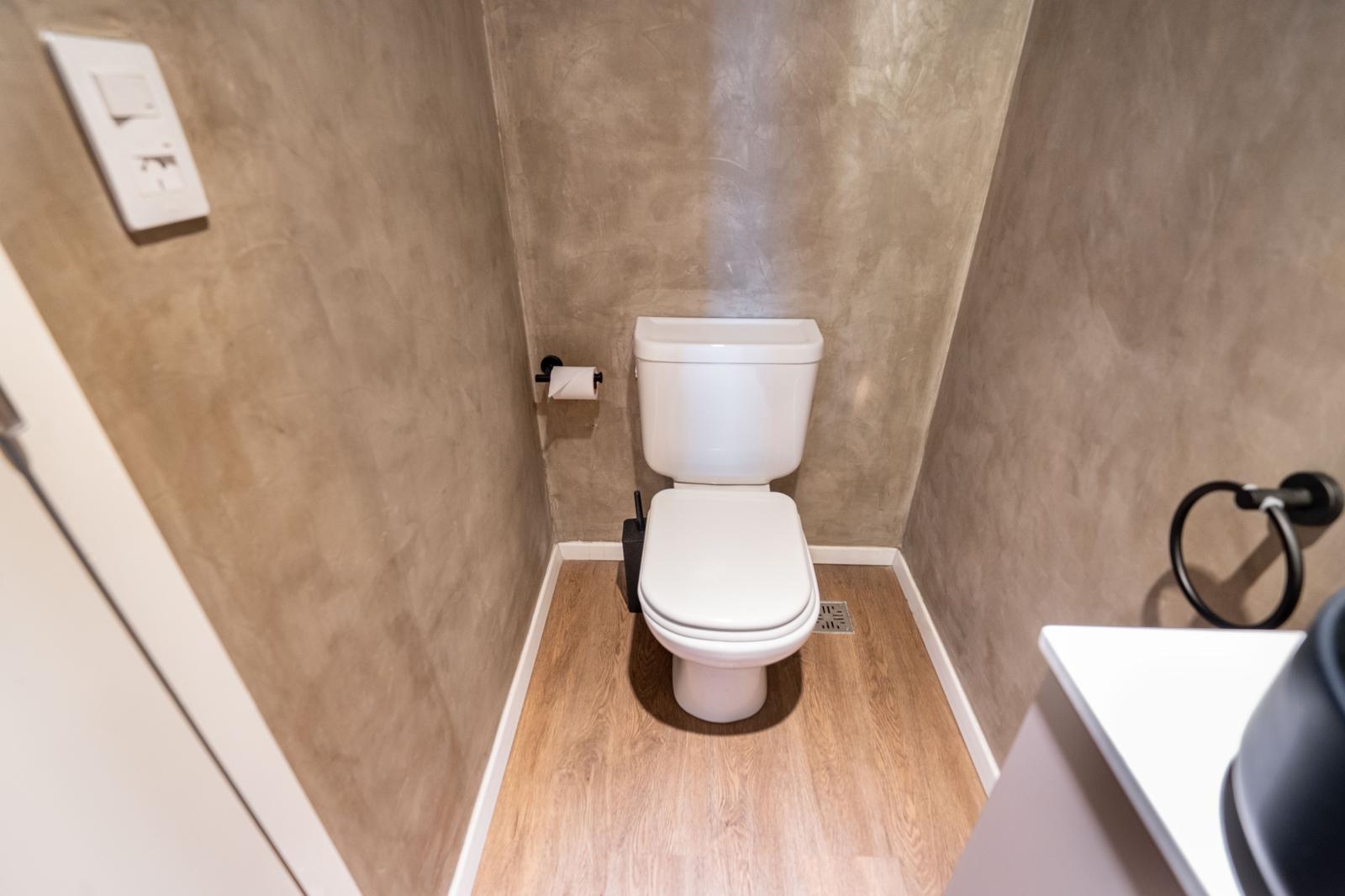 Un baño completo (en suite) y un toilette, ambos revestidos en microcemento con muebles de mdf premium y mesadas de silestone.