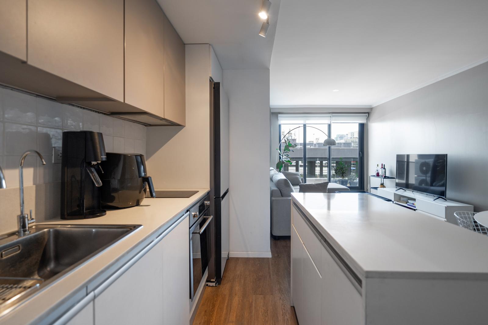 Cocina con mesada e isla central de silestone. Espacio con mueble desayunador de 2m x 0,5m
