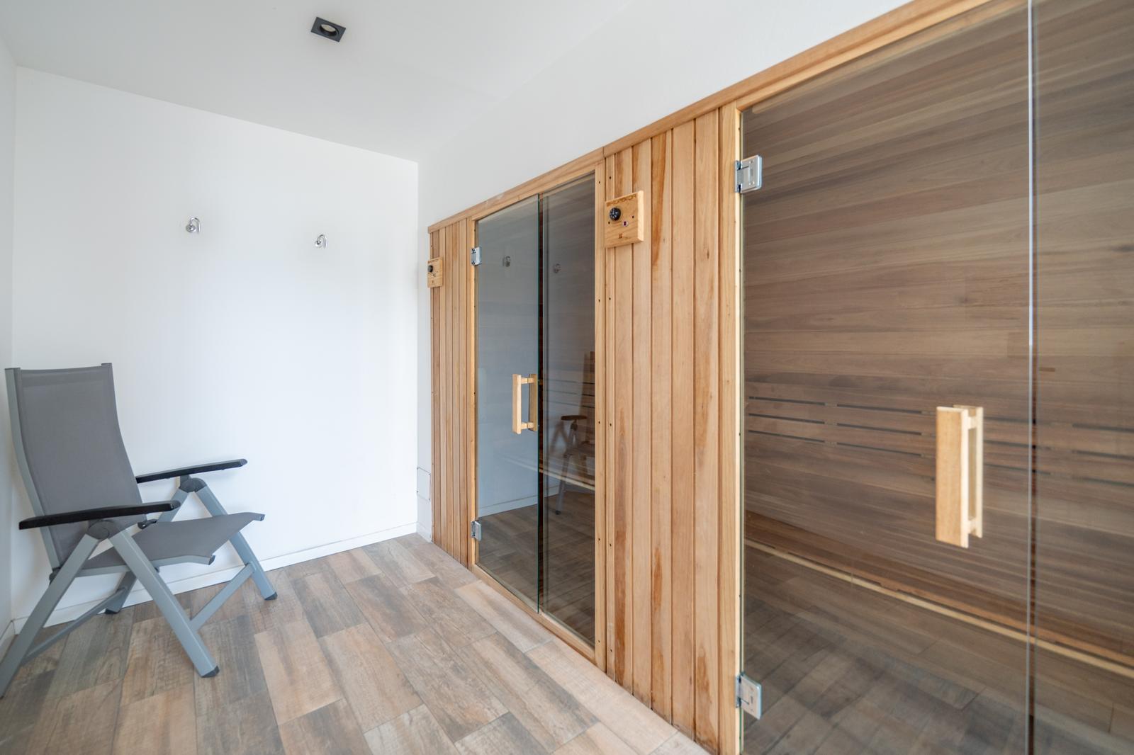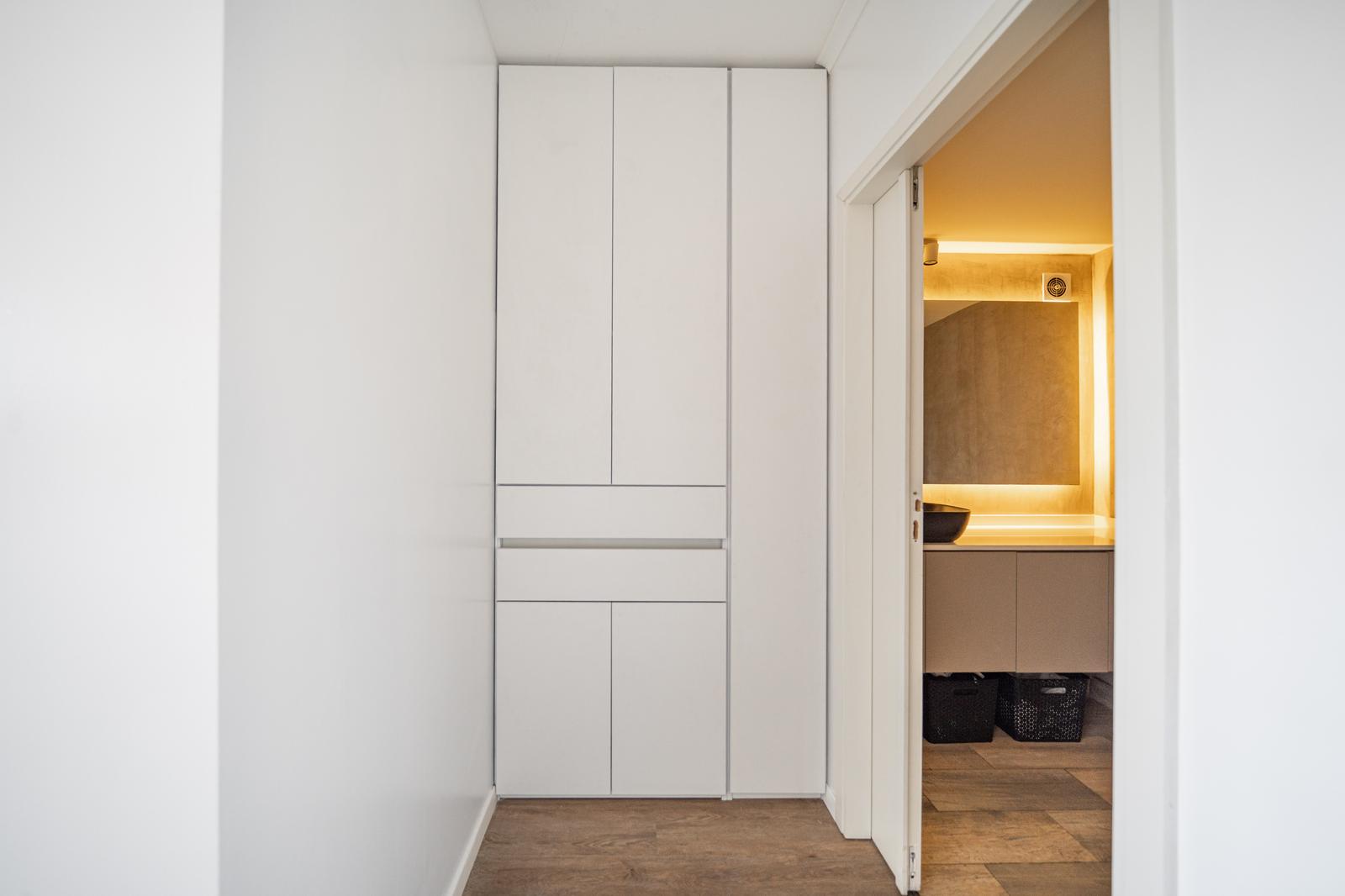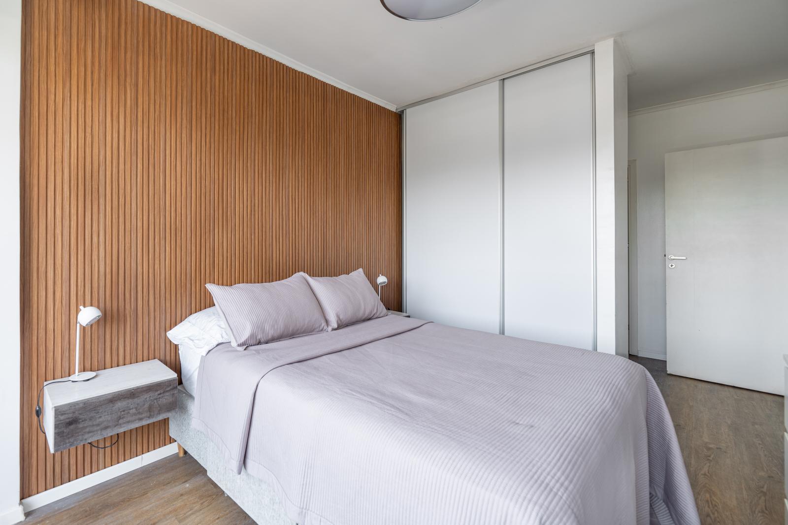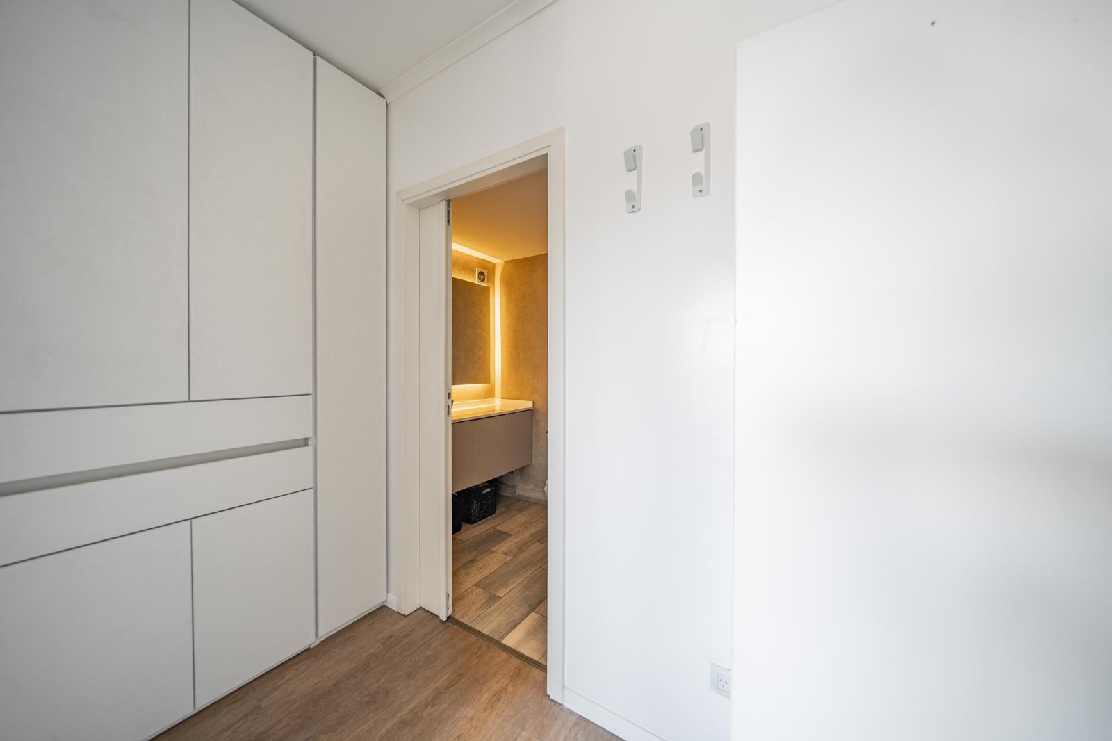 Un dormitorio en suite con placard y otro placard en antebaño. Revestimiento en varillado con tratamiento acustico en el dormitorio