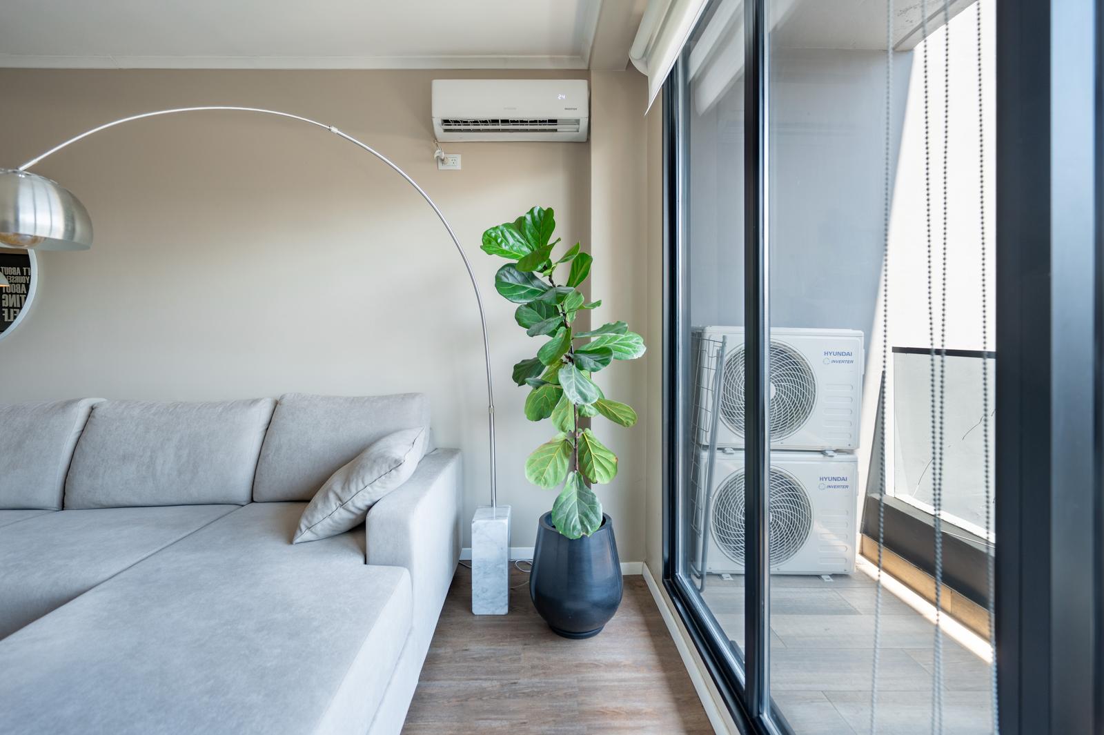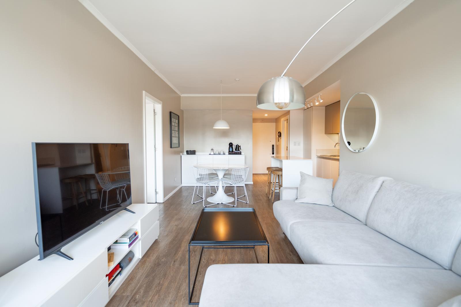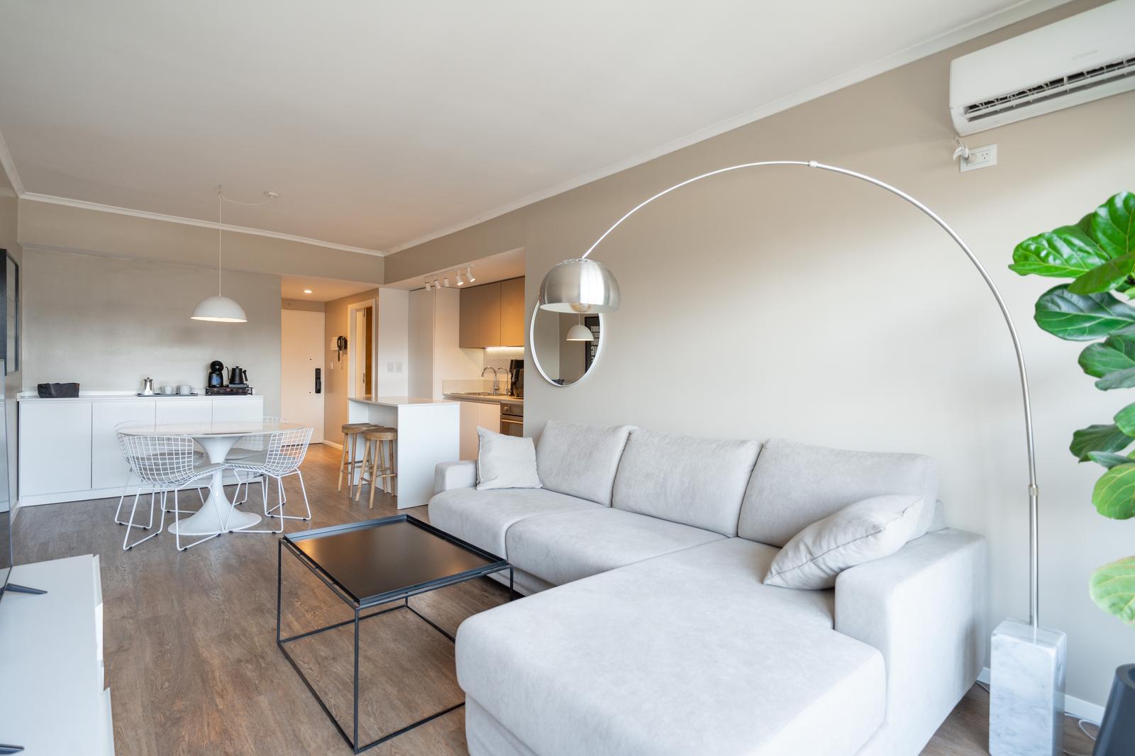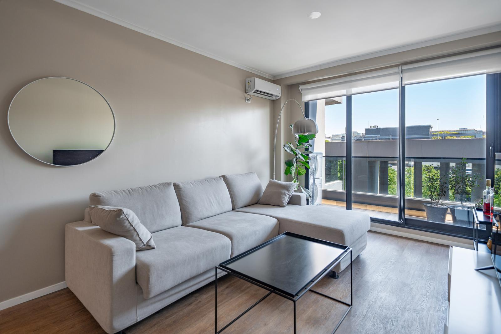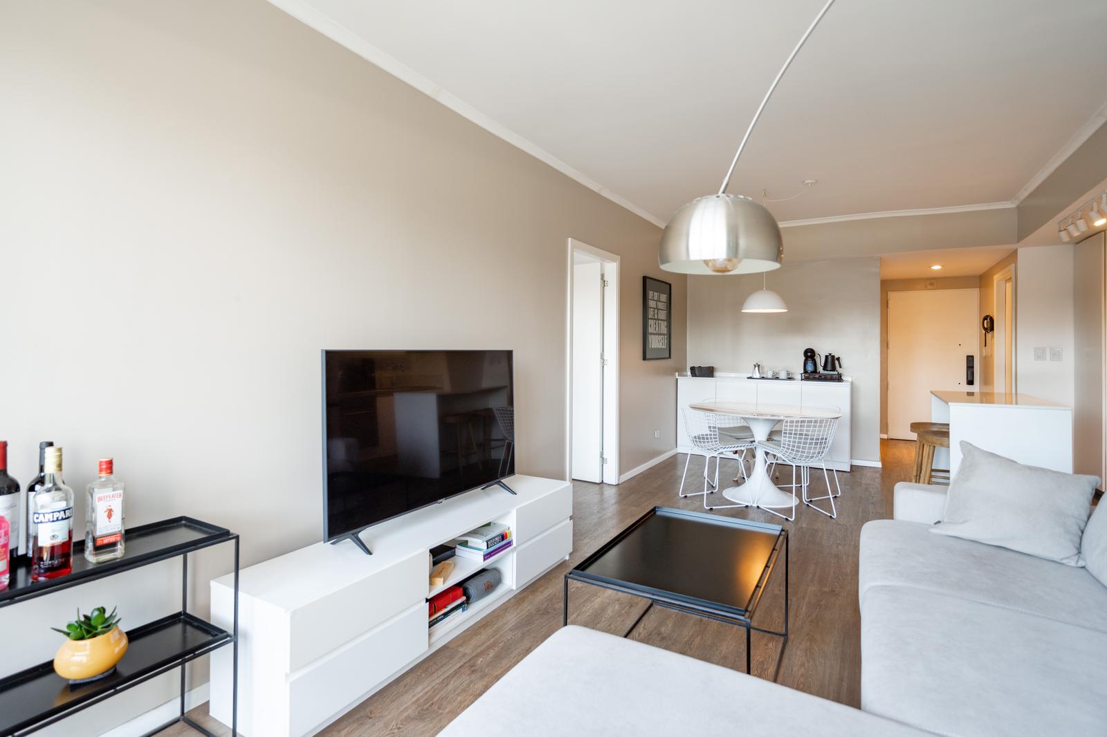 Dispone de living comedor con amplio ventanal corredizo, de piso a techo y salida a balcón.