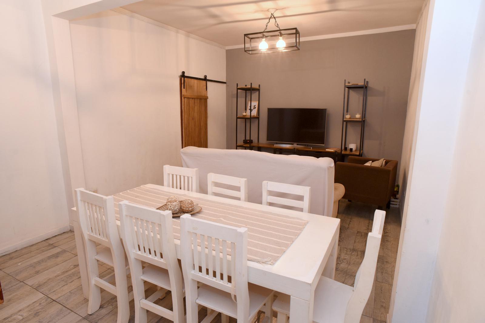 Planta Baja: Se ingresa a un estar que nos conecta con la escalera que va al primer piso y la puerta que da ingreso al Living-comedor de grandes dimensiones y una amplia cocina con isla y barra desayunadora. A través de una puerta granero accedemos a un baño completo y un dormitorio.