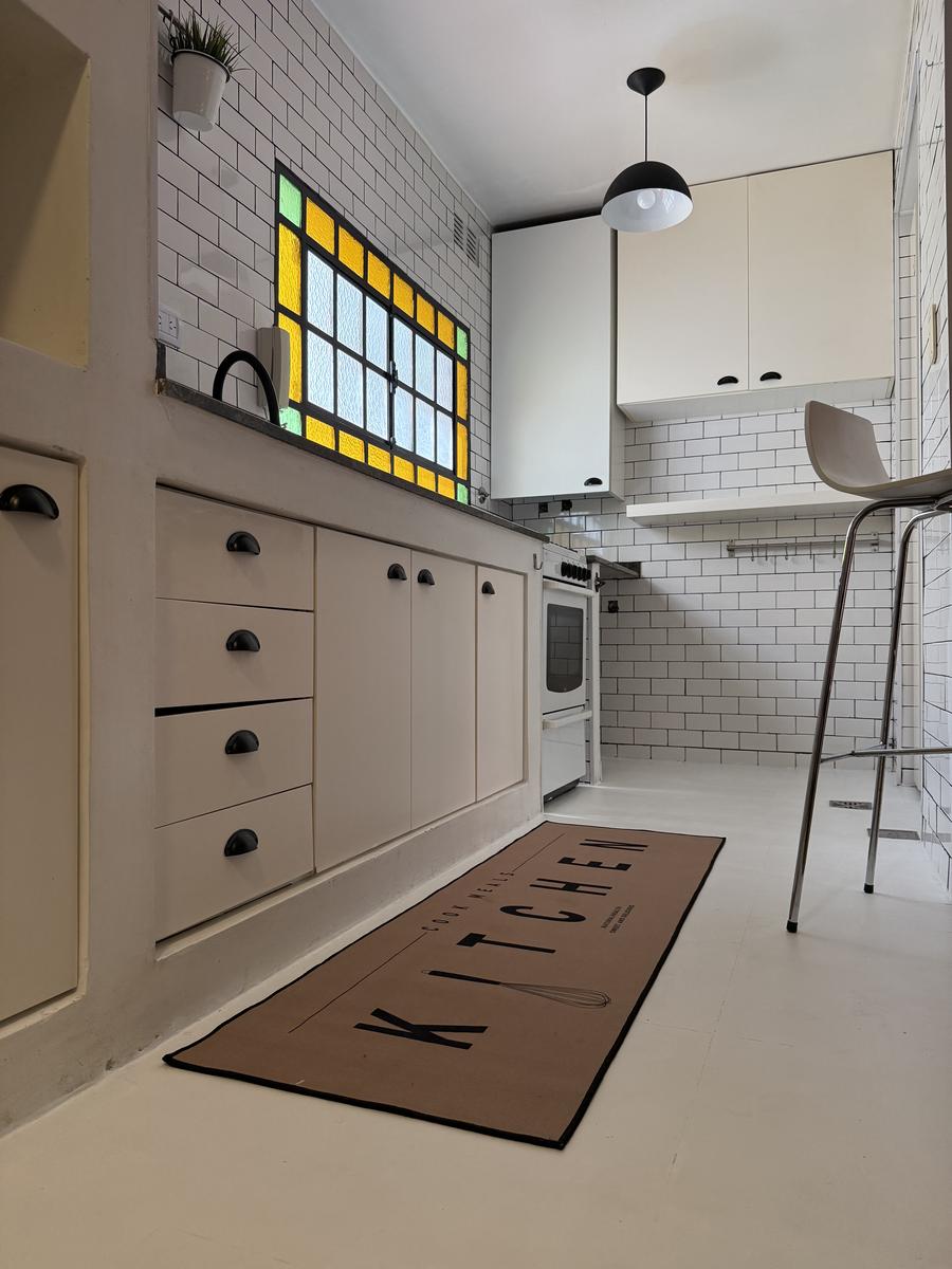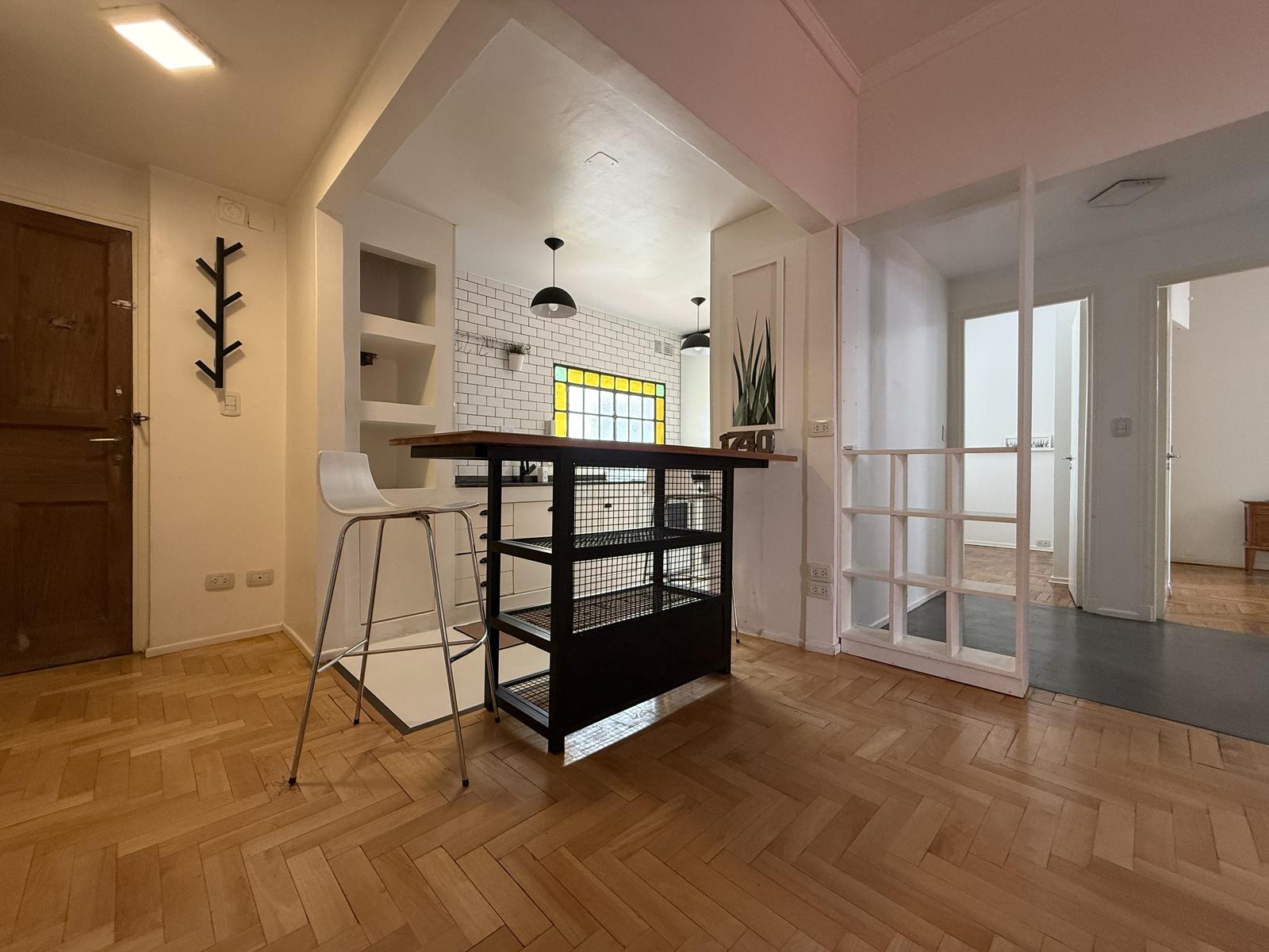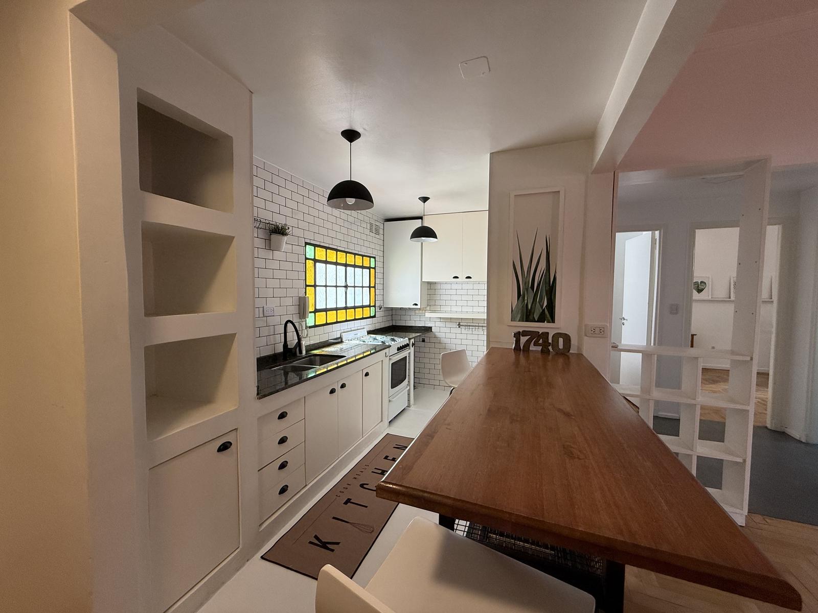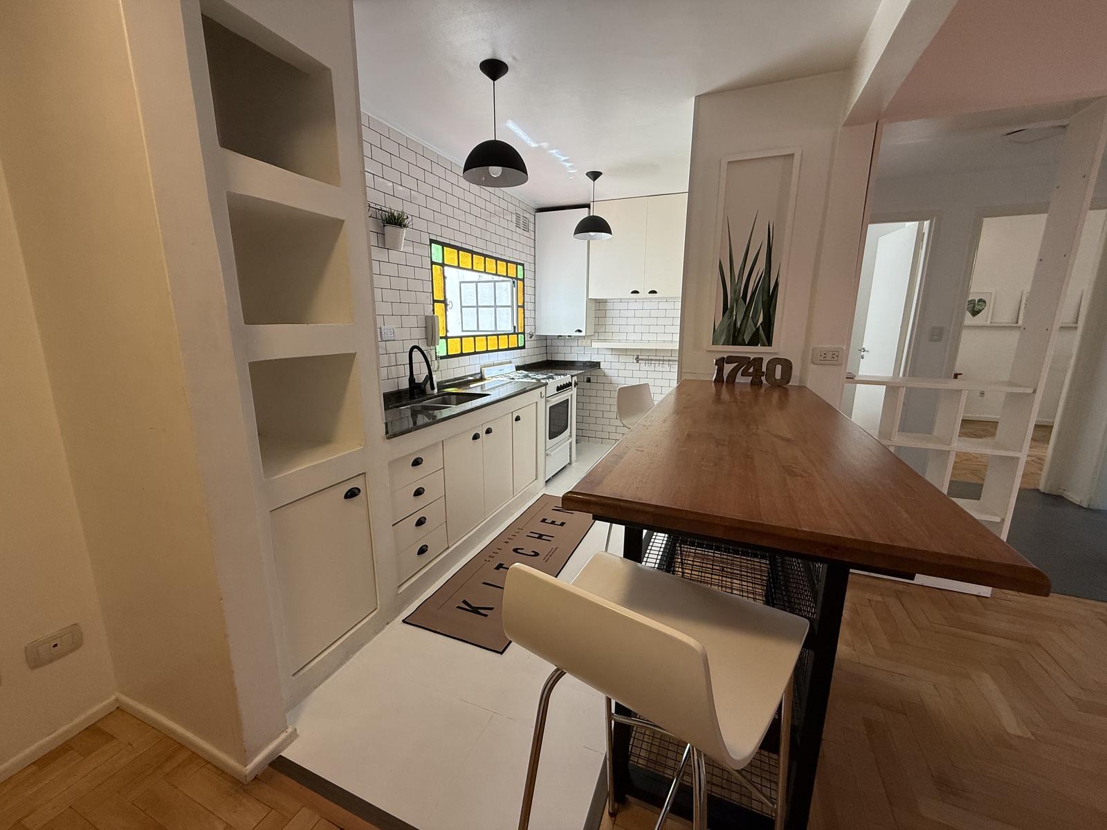 Cocina moderna, remodelada con excelente gusto y ventilacion al exterior… Mucho lugar de guardado y barra desayunadora integrada al living comedor.